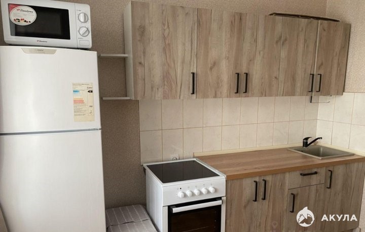 Полностью оборудованная кухня: холодильник, плита с 4 конфорками, духовка, микроволновка, электрический чайник, небольшой набор посуды.